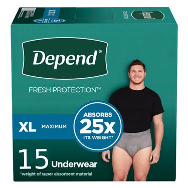 Depend Fresh Protection para hombre, tamaño Extra Large (XL), paquete de 15 unidades. Ofrece máxima protección para la incontinencia urinaria con su avanzada tecnología DryShield™, que absorbe hasta 25 veces su peso, manteniendo la piel seca y neutralizando olores para una mayor confianza durante el día. Diseñado especialmente para el ajuste y comodidad masculina, brindando seguridad y discreción en cada uso.