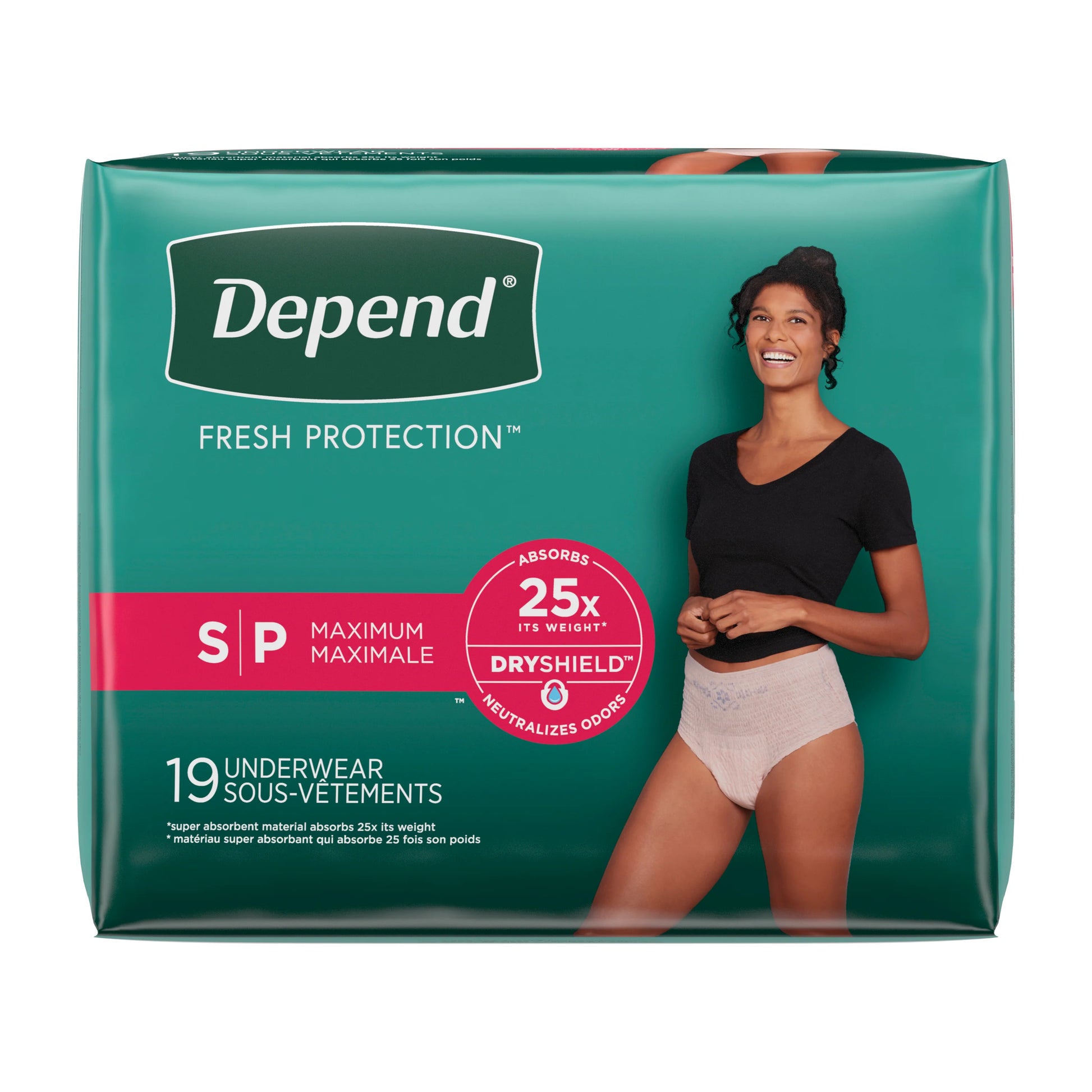 Depend Fresh Protection para mujer, tamaño Small (S), paquete de 19 unidades. Ofrece máxima absorción y protección discreta gracias a su tecnología DryShield™, que absorbe hasta 25 veces su peso y ayuda a mantener la piel seca. Además, neutraliza olores para brindar confianza durante todo el día. Ideal para quienes buscan comodidad, seguridad y discreción en el manejo de la incontinencia urinaria.