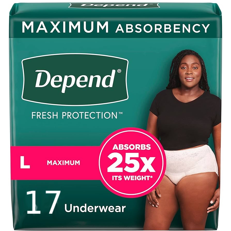 Depend Fresh Protection para mujer, tamaño Large (L), paquete de 17 unidades. Diseñado para ofrecer máxima absorción y discreción. Su tecnología DryShield™ absorbe hasta 25 veces su peso, ayudando a mantener la piel seca y neutralizar los olores. Ideal para el manejo diario de la incontinencia urinaria, brindando seguridad, comodidad y confianza en cualquier momento del día.