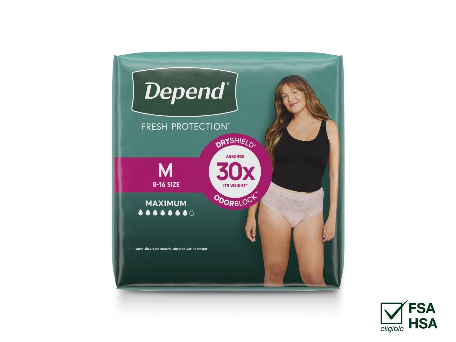 Depend Fresh Protection para mujer, tamaño Mediano (M), paquete de 18 unidades. Brinda máxima protección contra escapes con su tecnología DryShield™ que absorbe hasta 25 veces su peso y ayuda a neutralizar olores. Ideal para el manejo discreto de la incontinencia urinaria, ofreciendo comodidad, seguridad y confianza durante el día.