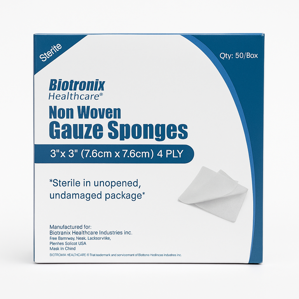 Gasas no tejidas estériles de 4 capas, tamaño 3” x 3” (7.6 cm x 7.6 cm). Fabricadas por Biotronix Healthcare, estas gasas son ideales para limpieza de heridas, absorción de fluidos y cuidado postoperatorio.
