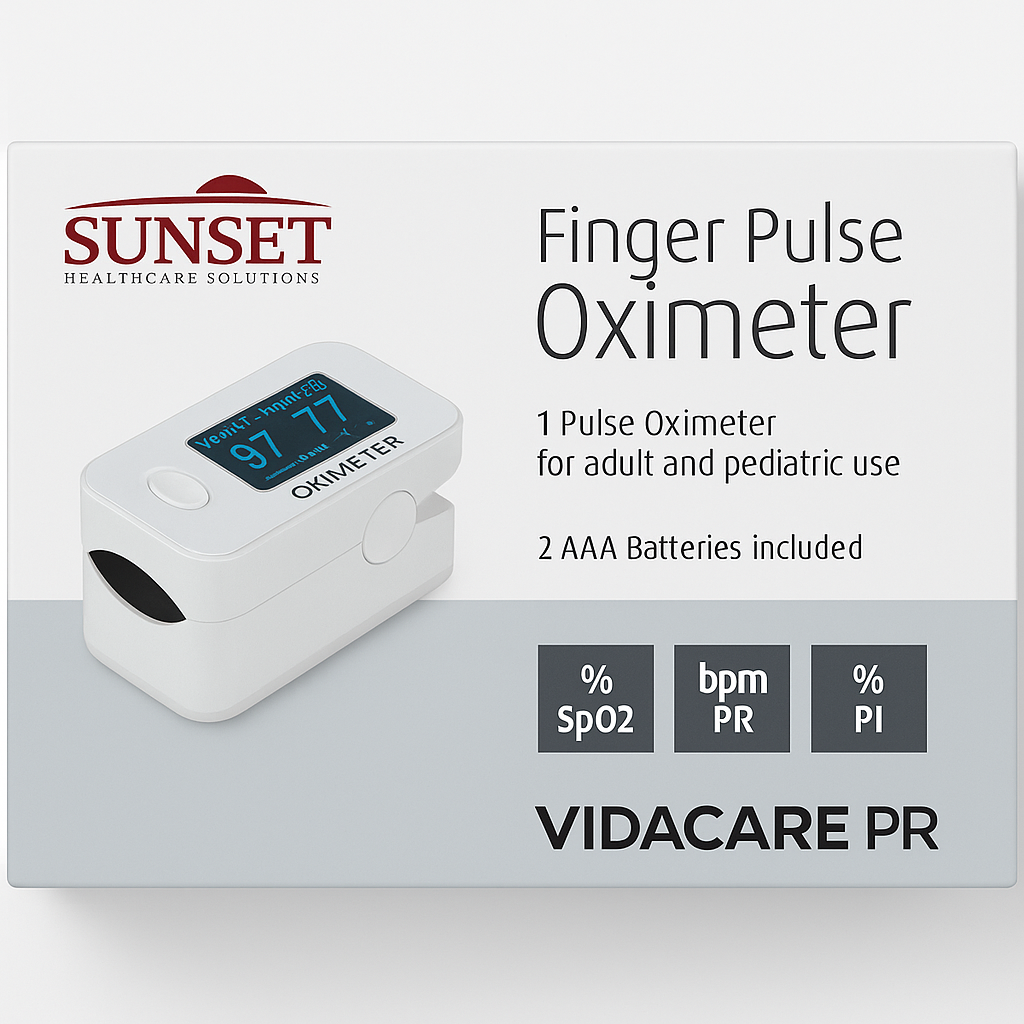 Oxímetro digital de dedo Sunset Healthcare Solutions, ideal para monitorear la saturación de oxígeno (SpO2), frecuencia cardíaca (bpm PR) y el índice de perfusión (% PI).
