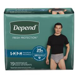 Depend Fresh Protection para hombre, tamaño Small/Medium (S/M), paquete de 19 unidades. Diseñado específicamente para brindar máxima protección masculina contra la incontinencia urinaria. Su tecnología DryShield™ absorbe hasta 25 veces su peso, manteniendo la piel seca y ayudando a neutralizar los olores para una sensación de seguridad y discreción durante todo el día. Ofrece un ajuste cómodo y seguro para el estilo de vida activo.